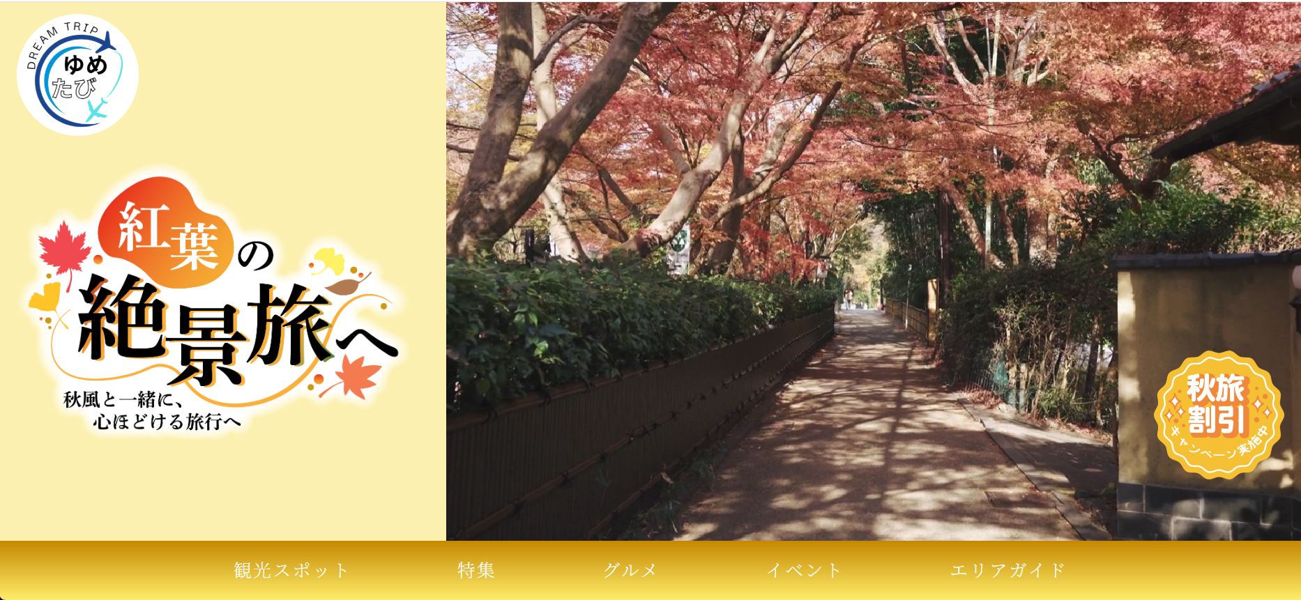 生徒が制作した旅サイト「夢旅」は、季節ごとの魅力を丁寧に伝えるデザインが特長です。紅葉や温泉など、秋に訪れたいおすすめスポットを写真と文章でわかりやすく紹介し、旅に出たくなる気持ちを高めてくれます。